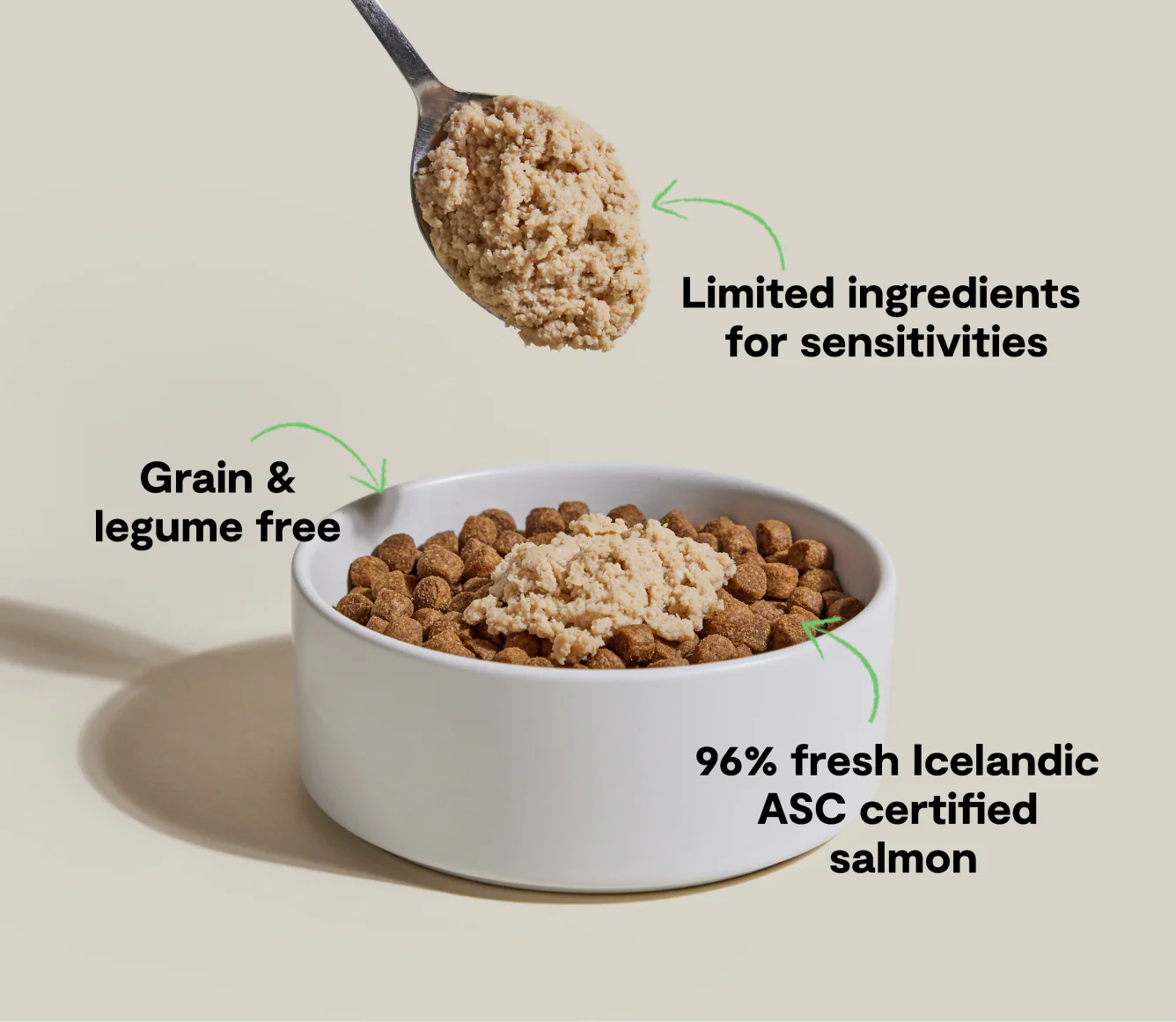 Crafted with 96% fresh Icelandic salmon, this silky mousse is a delicious and nutritious way to add instant texture and variety to your dog's bowl. Grain- and legume-free and made in a human-grade facility with 100% human grade ingredients.
