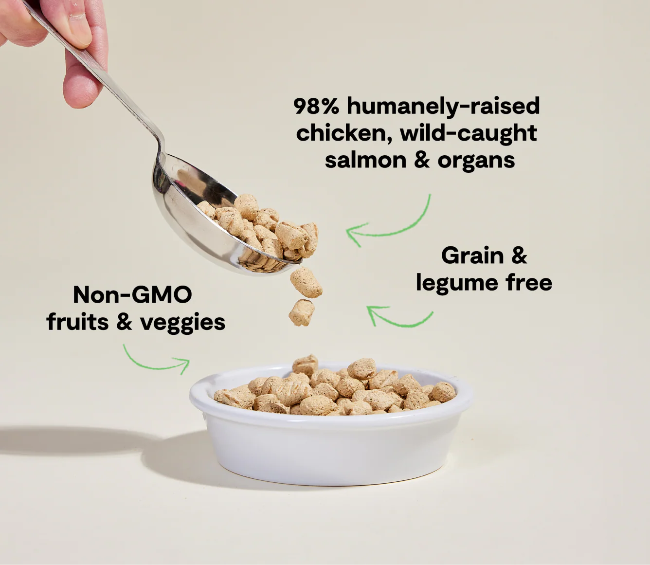 The most convenient way to feed your cat a raw-inspired diet, this minimally processed freeze-dried recipe can be an irresistible meal-mixer for your cat’s kibble or a delicious complete and balanced meal! Our Chicken & Salmon recipe contains a special blend of 98% humanely raised chicken, wild-caught salmon and nutrient rich organ meat including chicken neck and chicken liver, a true prey-model diet your cat won’t be able to resist.