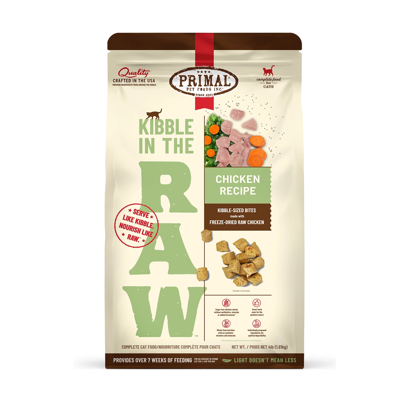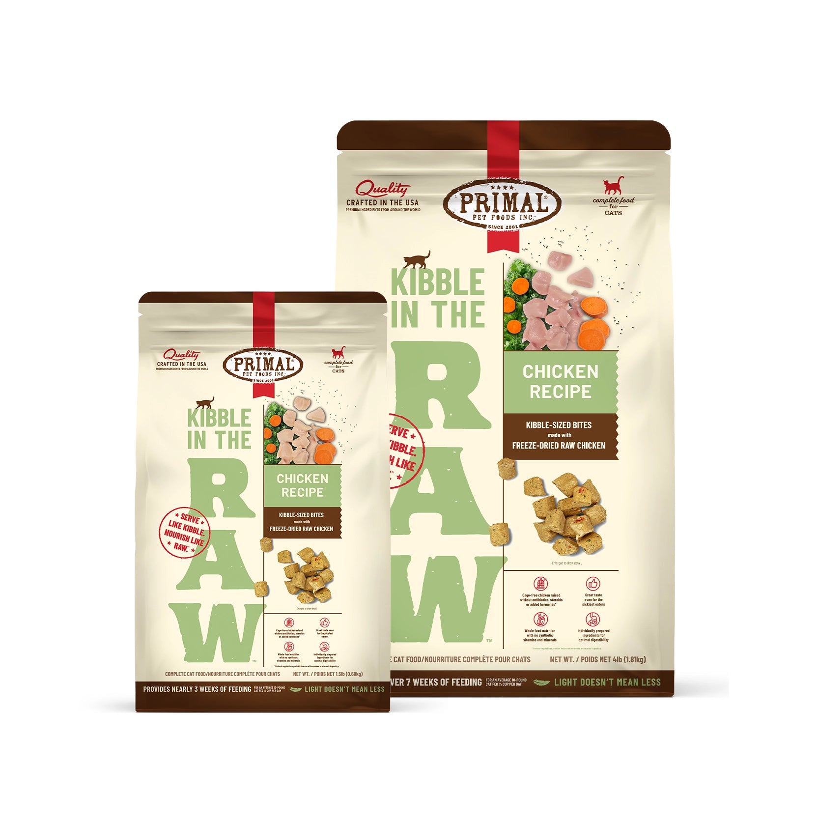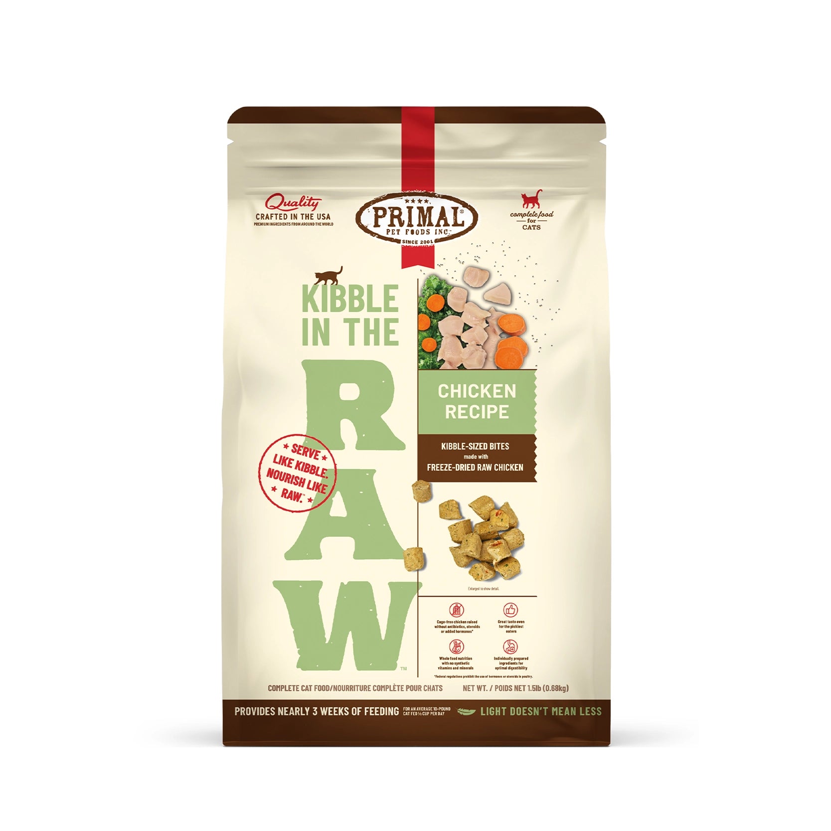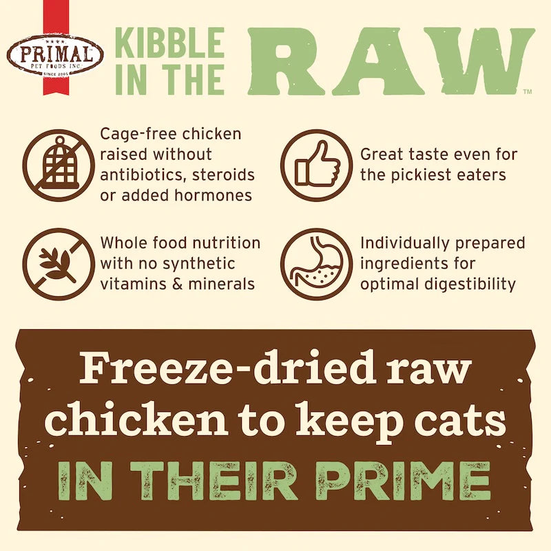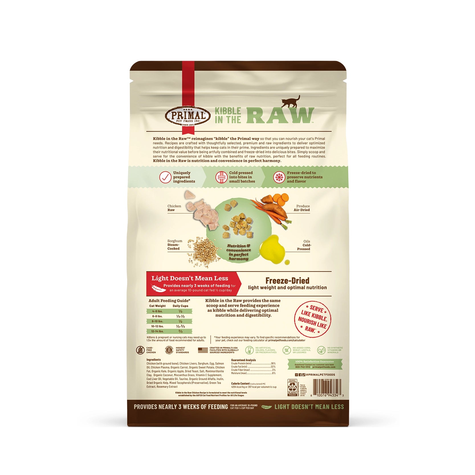 Kibble in the Raw reimagines “kibble” the Primal way so you can nourish your cat’s Primal needs. Our Chicken Recipe is crafted with cage-free chicken raised without antibiotics, steroids, or added hormones and other thoughtfully selected, premium, and raw ingredients. Crafted entirely of freeze-dried bites, this recipe delivers optimized nutrition and digestibility in the same scoop-and-serve feeding experience as kibble - perfect for all feeding routines. It's lighter and more dense than traditional kibble so you get more feedings out of every pound of food.