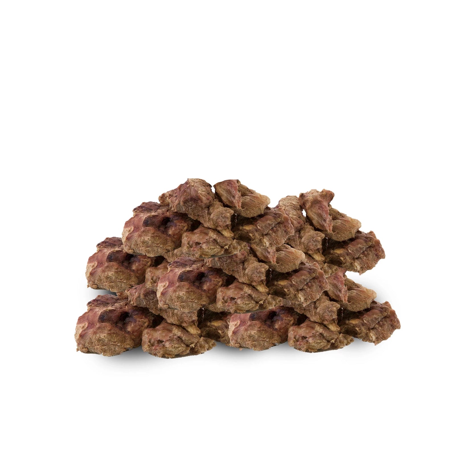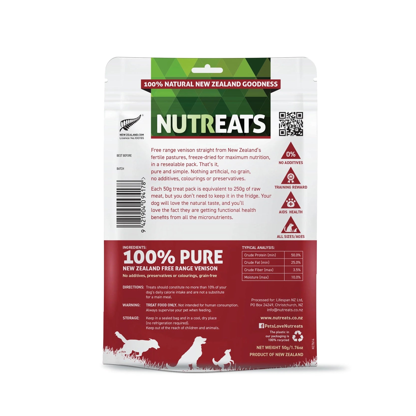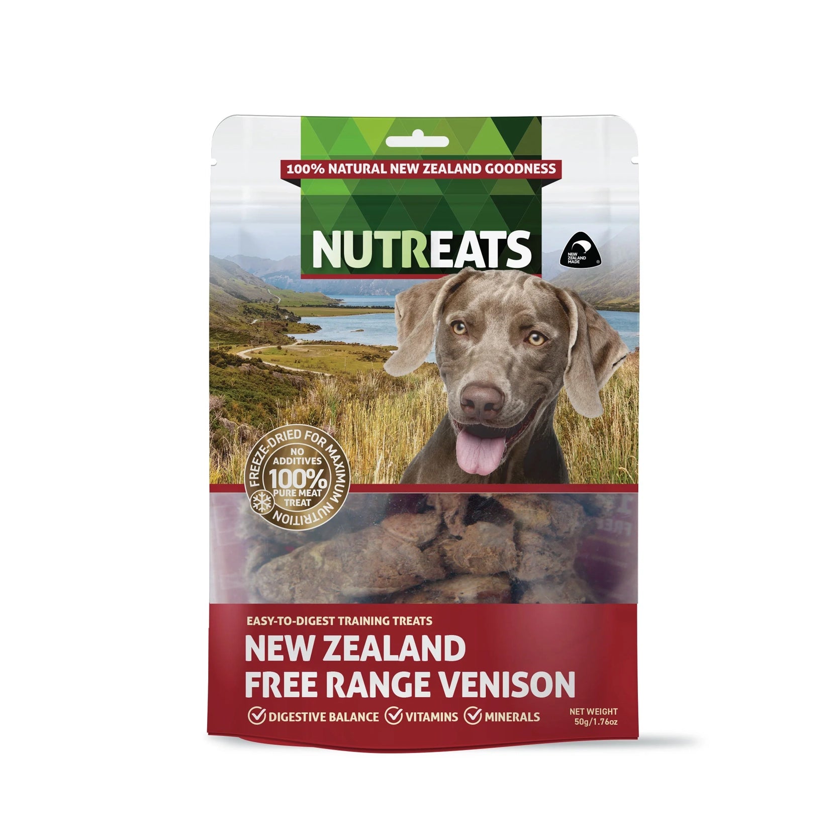 Freeze-dried New Zealand Free Range Venison dog treats Venison treats provide numerous advantages for your dog's health. Being a lean protein source, venison supports healthy natural muscle development, maintenance, and overall vitality. Venison is often considered hypoallergenic, making it an excellent option for dogs with food sensitivities. Rich in B-vitamins like B6 and B12, as well as minerals such as zinc and phosphorus, venison treats aid metabolic processes, support the immune system, and contribute to supporting a naturally healthy skin and coat. Additionally, venison contains Omega-3 fatty acids, which can support heart health and promote healthy natural cognitive function. Its low fat content can also be a suitable treat for weight management.
