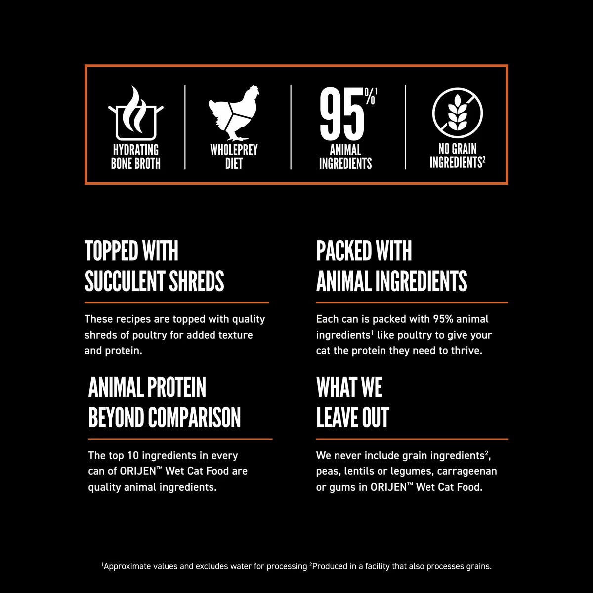 Nourish your cat completely with hearty WholePrey animal ingredients and real shreds of meat, poultry or fish in ORIJEN™ Chunks & Shreds Wet Cat Food!